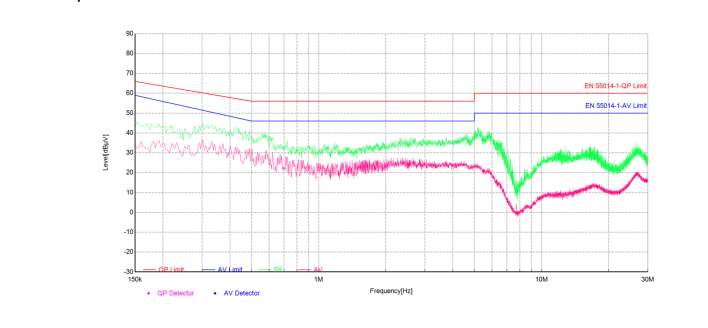 1.不同于有刷電機的電刷與換向器的續斷接觸產生的電火花為較大噪聲來源,無刷電機的噪聲主要由電機控制驅動模塊、開關管的開關噪聲產生。另外,機器自身的電源模塊:AC-DC、DC-DC模塊也會產生較大噪聲。