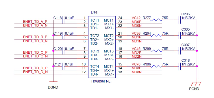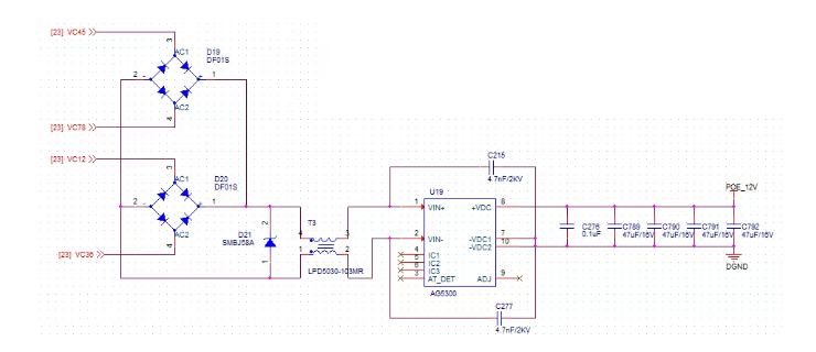 變壓器原邊的4個中心抽頭各通過一個1nF/2kV的高壓電容接PGND。圖3中的RJ45連接器的8根信號線連接到圖2中變壓器原邊對應的信號線上。圖4是POE電源相關的電路圖,電源模塊U2采用1個共模電感+2個共模電容組成的EMI濾波電路,共模電容為4.7nF/2kV的高壓電容,左邊兩個器件是合路橋堆,橋堆左邊的4根線接變壓器中心抽頭,合路后的兩根線接EMI濾波電路。