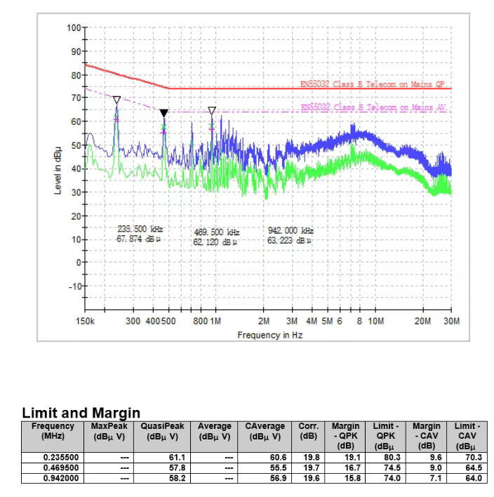 將共模濾波電容C277、C215的容值由4.7nF改為68nF/1kV的電容,修改后的CE測試結果見圖7,可見10M以下的CE噪聲顯著降低,特別是1MHz以下的開關頻率諧波下降更明顯,最小余量也有7.1dB,測試通過。更換的68nF//1kV共模電容的封裝為1210,原4.7nF/2kV共模電容的封裝是1206,電容更改后對PCB布線基本沒有影響。另外,POE接口的浪涌指標為1kV,用68nF//1kV電容也是可以承受的,所以整改方案被接受。