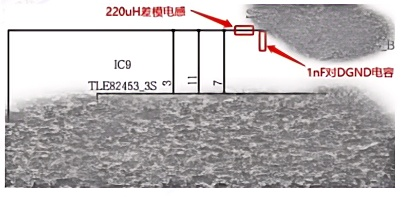 1.分別在芯片IC8、IC9、IC10的電源輸入端增加220uH貼片差模電感,并在差模電感遠離芯片端增加1nF對DGND電容。