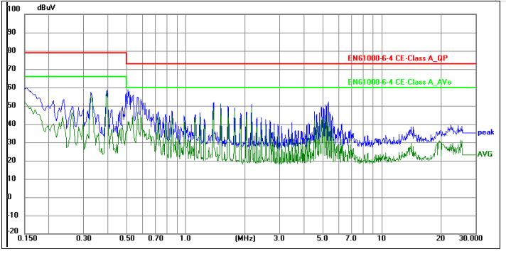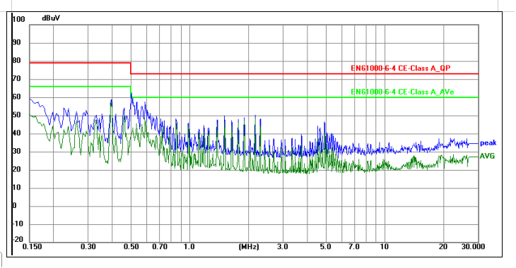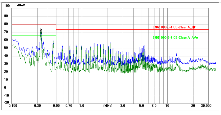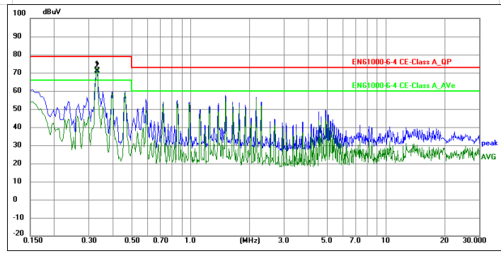 二.整改前問題:該產品為充電樁模塊電源,電磁兼容CE測試時,0.33MHz頻點AVG超標4Db,如下圖所示。
