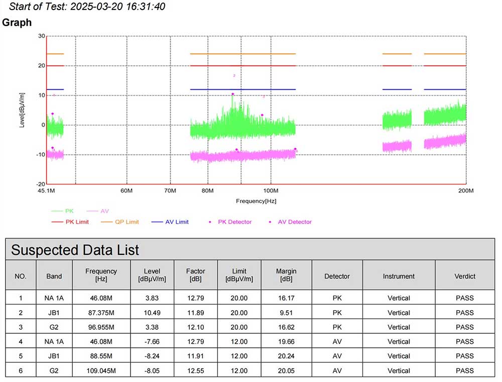 1.初步定位:首先斷開電機供電,僅對控制器進行測試,834MHz 頻點的輻射值降至 30dBμV/m 左右,說明干擾源主要來自電機及其供電回路。